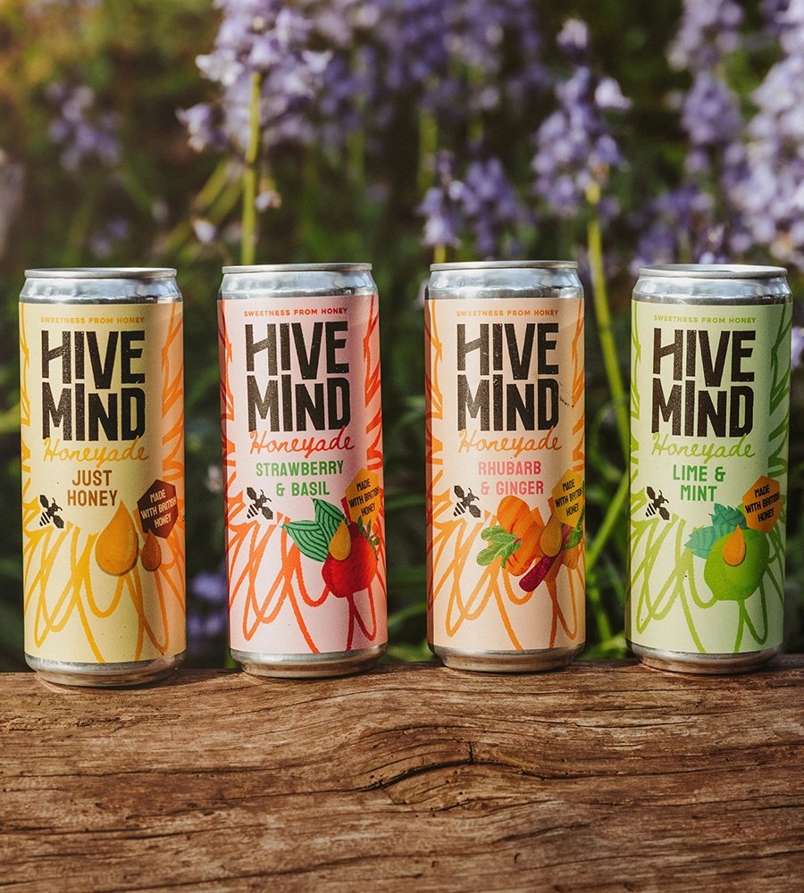 Spring 2025 sees Hive Mind enter the ‘honeyade’ fray, creating a 4-strong range of all-natural, ‘planet positive’ soft drinks sweetened with only a dash of British honey and an eclectic mix of countryside fruit, herbs and botanicals.