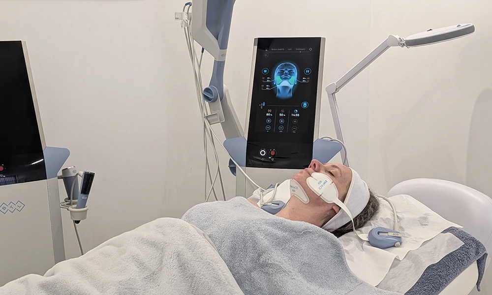 EMFACE is a non-invasive technology that simultaneously targets the skin and the underlying facial muscles. It combines two energies: high-intensity focused electromagnetic stimulation (HIFES) to strengthen and tone the facial muscles, and radiofrequency (RF) to heat the dermal layers, stimulating collagen and elastin production.