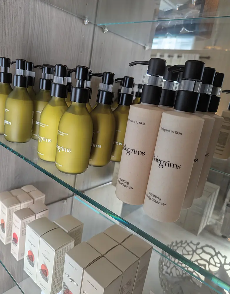 But the real secret, and the heart of Pelegrims’ star product, lies in the “tears of the vine.” Jerome vividly described how, after spring pruning the vine “cries.” These precious drops of sap are painstakingly collected, literally drop by drop. “The liquid that comes out is a superpower, 60 times the antioxidant potency as oranges.” This is due to resveratrol, a powerful polyphenol found in red grape sap, which becomes a key ingredient in their Facial Serum Concentrate. This truly feels like a brand imbued with love, born from a deep-seated ethos that refuses to compromise on quality, even if it means small, exclusive batches.