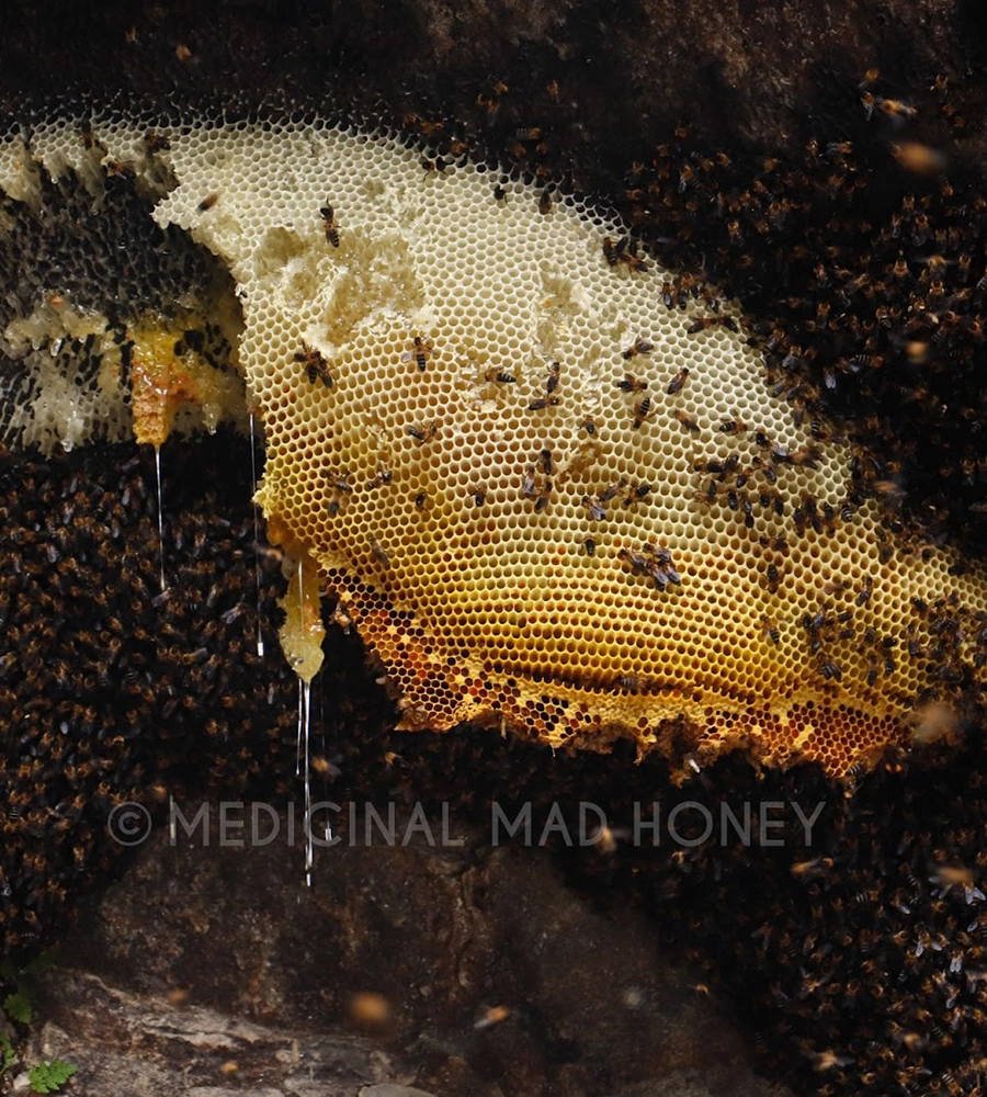 Mad honey is just another honey type-a sweet, sugary edible substance produced by bees. The only difference that adds “Mad” suffix to it is the presence of an extra psychoactive compound (grayanotoxin) in it, which is naturally present in flowers the bees visit.