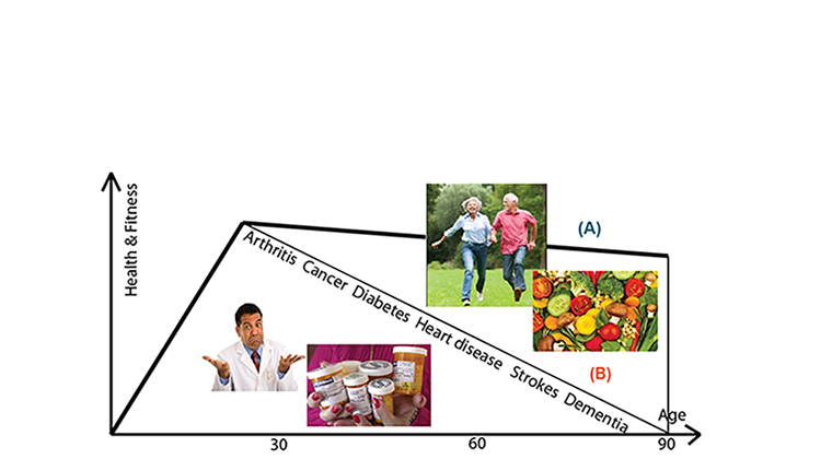 I believe we can make enormous shifts to improve our chances of good health and a long active life with a little effort and a lot of determination to break old strong established lifestyle habits. The choice really is ours to make; the diagram above depicts two extreme routes our lives from birth to death can follow. The route (B) is what is in store for the majority of us in the West if we carry on doing what we are doing but the route (A) is the alternative option if we start to make the necessary changes in what we are doing.