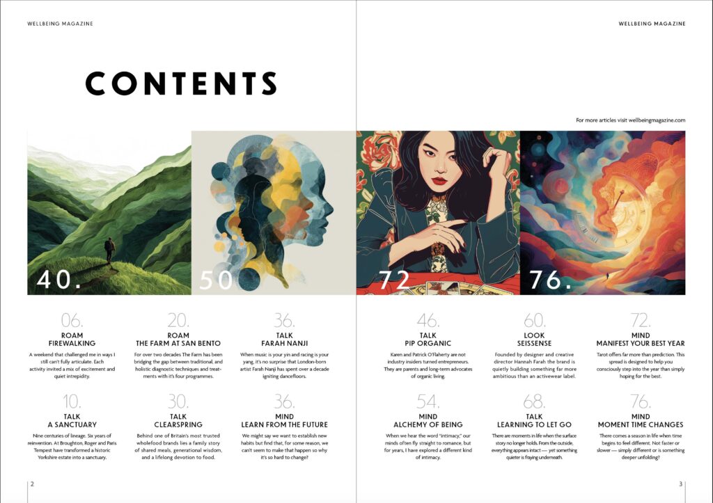 Across these pages, journeys continue worldwide: from The Farm in the Philippines to sensitive-soul retreats, from nature connection in Italy to the family legacy behind Clearspring. We explore identity, creativity and resilience with DJ Nija, investigate nourishment from dry fasting to collagen, and question what we absorb through our skin as much as what we consume.