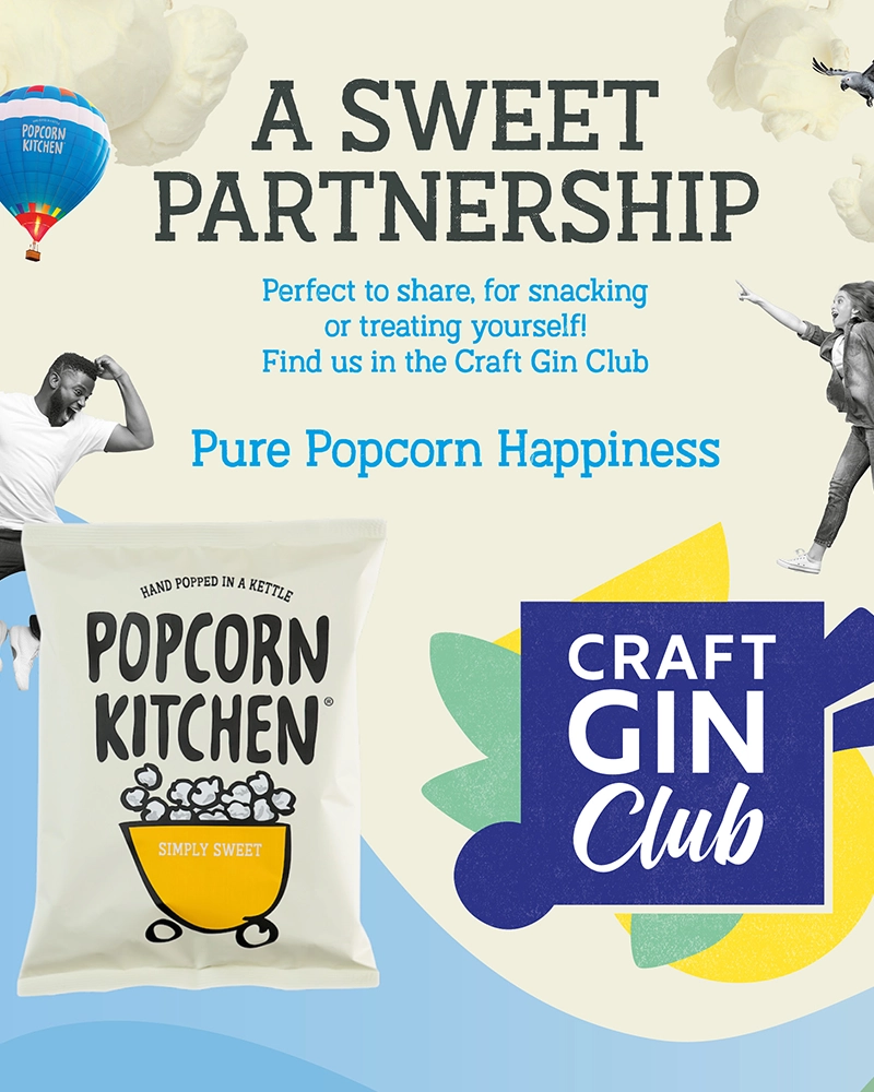 ‘As an artisanal snack we know all about being a discovery brand and the importance of mutually beneficial collaborations with like-minded food and drink aficionados,’ suggests Popcorn Kitchen founder, Louise Webb. ‘We love the Craft Gin Club’s unwavering mission to introduce small craft distillers to a wider audience with intriguing parcels of small batch gins, tonics, cocktail making essentials and meticulously matched snacks. This September sees timeless Popcorn Kitchen classic, ‘Simply Sweet’ make its eagerly anticipated guest appearance within the Gin Club’s September box, alongside a fine upstanding Northern Irish gin and functional soft drink hero Trip. At the same time Simply Salted will be a special guest within their fledging rum appreciation bundle.’