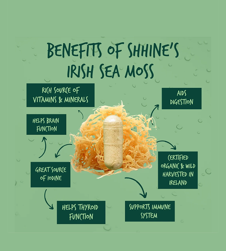 Shhine’s organic Irish sea moss is hand-harvested from the pristine waters of the Atlantic Ocean off the coast of Ireland. Sourced from a fourth-generation family-run seaweed farm, each capsule is crafted with purity, sustainability, and maximum nutrition in mind. By prioritising eco-friendly harvesting methods, Shhine ensures that its sea moss retains its powerful natural benefits while promoting ocean health.