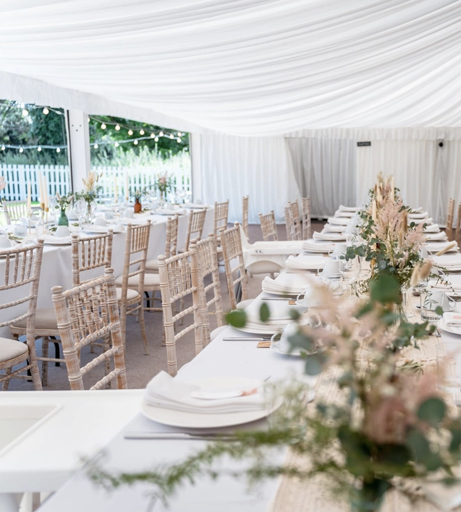 Flowers instantly breathe life into any space. Large centrepieces make a bold statement, but don’t overlook the impact of smaller arrangements dotted throughout the marquee. Consider your season – spring bulbs for Easter events, rich autumnal colours for harvest celebrations, or tropical blooms for summer parties.